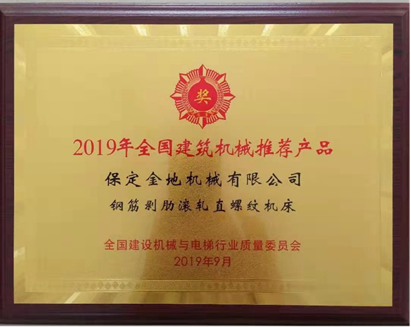 25日晚上全國建設機械與電梯行業質量委員會在無錫太湖國際博覽中心旁君來世尊酒店舉辦了“2019年建機推薦頒獎典禮暨中外客商迎賓晚宴”。我公司的主營產品鋼筋剝肋滾軋直螺紋機床喜提“2019年全國建筑機械推薦產品”,“金地”品牌又一次用高品質產品獲得大家的認可!